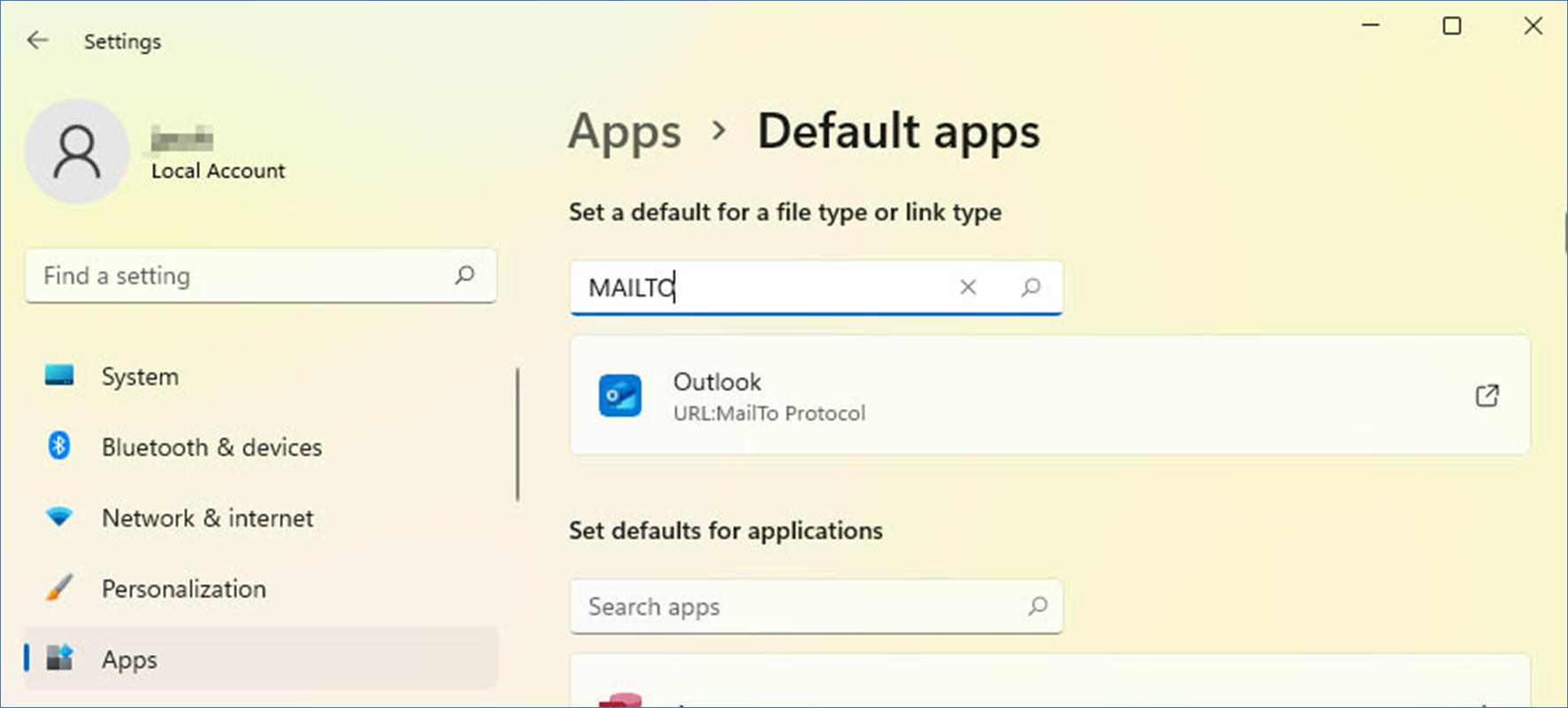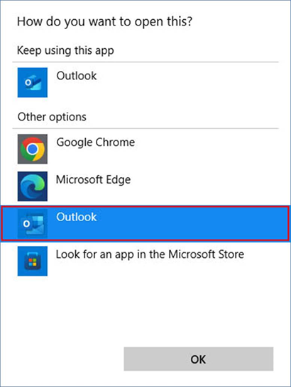 To configure Microsoft Outlook Classic as the default email client, please go to Settings > Apps > Default Apps > and configure Outlook to the MAILTO action, as in the following image: