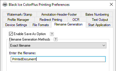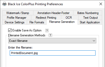 If Exact filename is selected, and a filename with extension is provided, (for example, PrintedDocument.jpg) the printed document is named with the .jpg extension and the settings under the File Formats tab are ignored.