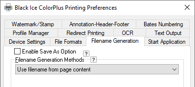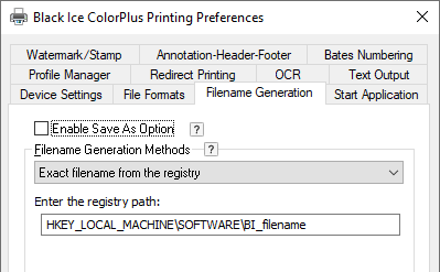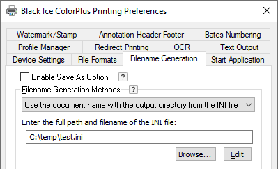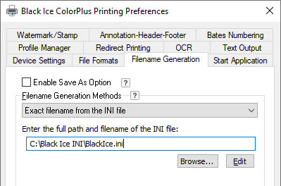 Enter the full path and filename in the INI file - Enter the INI file’s location in the “Enter the full path and filename of the INI file” field of the printer driver “Filename Generation” tab.