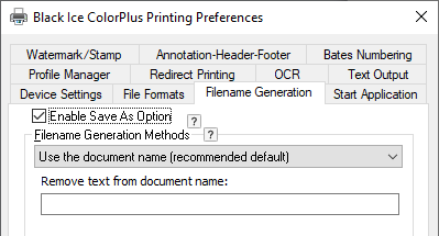 The ‘Remove text from document name’ feature allows one to remove characters from the document name. Many applications like Microsoft office or Cristal Report place a prefix front of the document name. For example a Crystal Report document name start with “Crystal Reports - ABC - (CC_Code39_S3)” but the user only wants “ABC - (CC_Code39_S3)”.
