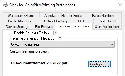 Custom file name scheme can be built using the Custom File Name utility. A preview shows the selected custom file naming scheme if the output contains multiple files. If the result of the document conversion is a single output file, for example, PDF file, the filename follows the first line of the example. Press Configure… to modify settings. To use custom file naming scheme, disable the Enable Save As Option. For more information, please see the Custom File Name Configuration section.