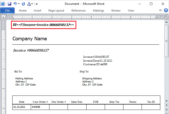 (MS Word document with the embedded “Filename” tag)