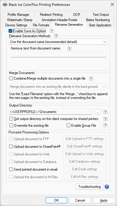 The Black Ice Printer Drivers provide complete control over the names of the files generated when printing. On the Filename Generation tab, the user is able to configure the Upload and Email options.