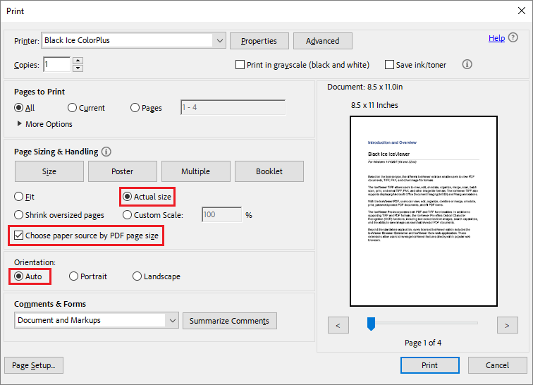 3. Under the Page Sizing & Handling section, please make sure to select the Actual size option, and enable the Choose paper source by PDF page size checkbox. Under the Orientation section, please select the Auto option.