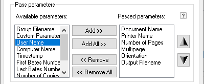 To pass a parameter to the started application, make sure that the desired parameters are added to the Passed Parameters list. To add parameters to the list, select the appropriate parameter to pass from the Available parameters list and press the Add button. Click on the Add All button to add every parameter.