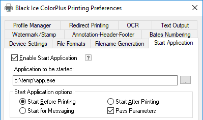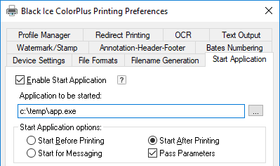 Select this option to start the specified application before the printer driver starts printing. This must be used if an application needs to change the printer driver settings through the messaging interface, or the application needs a long start-up time.