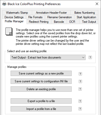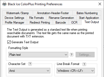 To configure Text Output in Black Ice printer driver 14.45 and later versions, navigate to Control Panel > Devices and Printers > right click on the Black Ice Printer Driver > Printing Preferences > navigate to the Profile Manager tab and select the Text Output - Extract text from documents profile.