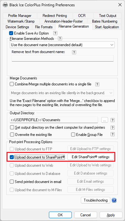 To configure the Printer Driver to upload the printed documents directly to SharePoint, please navigate to the Filename Generation tab on the Printing Preferences window, and enable the Upload document to SharePoint option. To read about how to configure SharePoint settings in the Printer Manager or during saving, please see the SharePoint and the Upload to SharePoint using the Save As dialog section.
