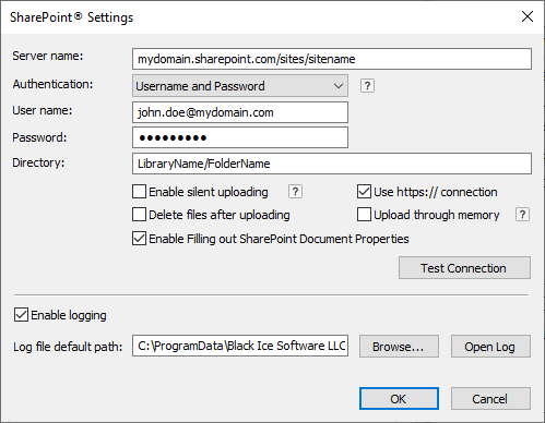 SSL (Secure Sockets Layer) is a protocol that provides communication security over the Internet. Selecting the Use https:// connection option, the Printer Driver will use secure https protocol to upload every file to the SharePoint server.