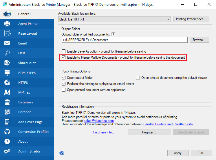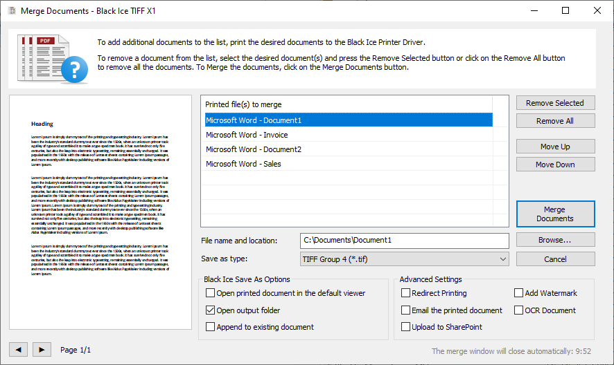 Black Ice Printer Drivers offer a user-friendly way to merge/combine multiple print jobs into a PDF or TIFF file with a preview feature. The User can rearrange the document in the merge window list by moving up or down the document. The Preview Window is an exceptionally useful feature that lets users view and identify the selected document in the Merge Window list to organize the document.