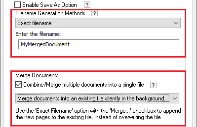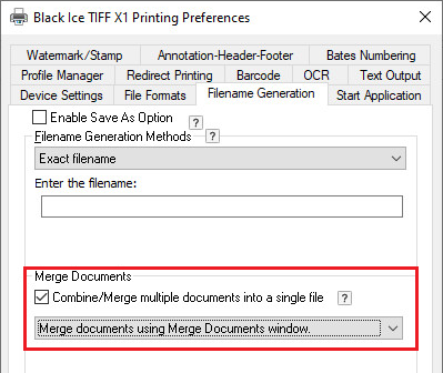 Alternatively, go to the Filename Generation tab and check the Combine/Merge multiple document into a single file option and select the Merge documents using Merge Documents window option.