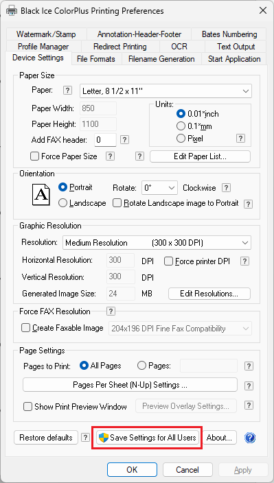Administrators can save their current settings for every user on the computer by clicking the Save Settings for All Users button on the Device Settings tab.