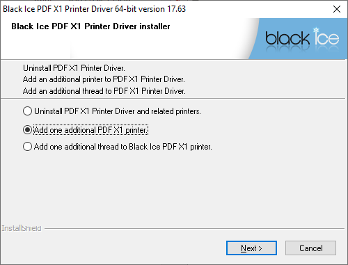 If the evaluation version of the Printer Driver is already installed without additional printers, one can add printers by running the Printer Driver installer executable again. When the following window appears, please select the Add one additional printer option and click Next.