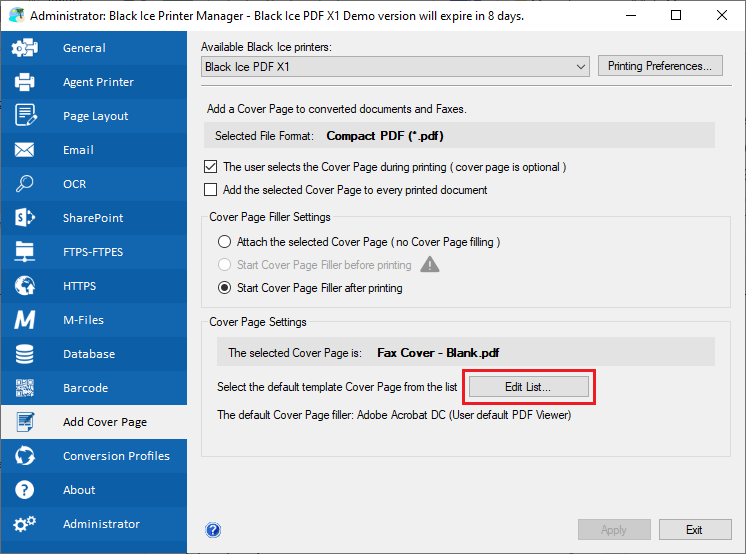 To remove Common cover pages one has to run Printer Manager as an Administrator (right click on the Icon and select “Run as administrator”). In Printer Manager navigate to Cover Page Filler tab and click Edit List… button.