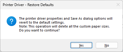 Restore defaults - The Restore defaults button will restore the default printer settings from the printer configuration INI file for the current User only. The Save As… dialog option reverts to the same default settings as well. This operation deletes all the custom paper sizes. Once pressed, the following warning message is displayed: