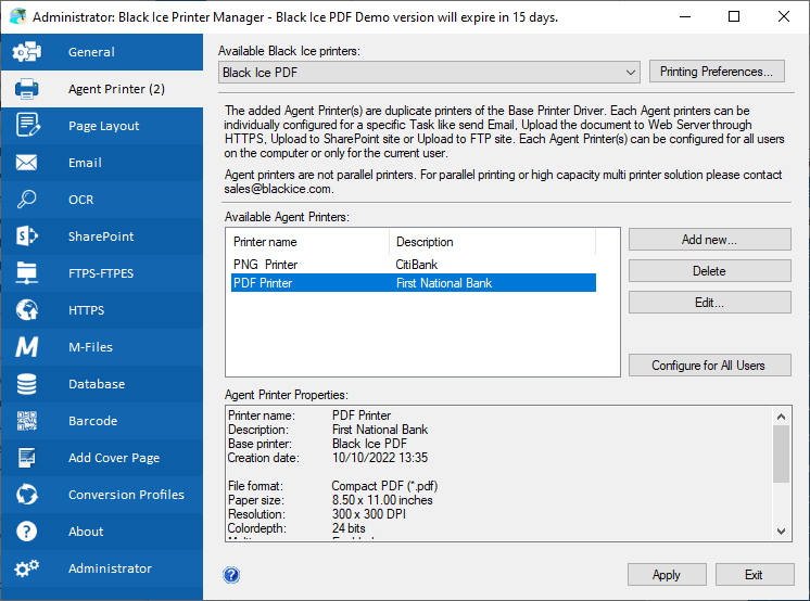 Agent Printers allow the creation of new printers based on an existing Black Ice Printer Driver. Agent Printers can be configured with unique settings for routine specific tasks without having to repeat printer configuration steps each time. For example, the user can create a printer for TIFF conversion and another for PDF conversion, or creating a printer for emailing PDF reports. The user can add, edit, and modify Agent Printers as necessary.