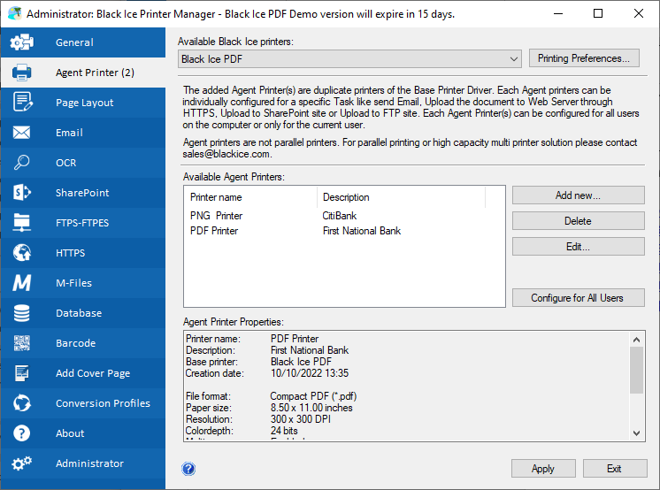 Agent Printers enable users to create a printer with specific settings for frequently used tasks. With Agent printers the user can create separate printers with pre-defined settings for routine tasks, such as email address and file formats, without having to repeat the printer configuration steps each time. For example, one has to email out invoices or shipping receipts to the same customers, one can simplify the process by setting up an Agent printer for the company with an email address. One customer may prefer to receive the invoice in Image PDF format, and the other in Compact PDF format. One can create a separate printer for Image PDF and another for email Compact PDF attachments. The user can create as many Agent Printers as necessary.