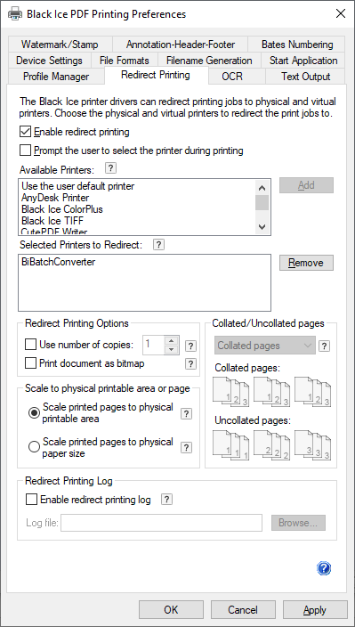 Enable redirect printing log - Enables or disables the log file generation specifically for redirect printing. Log filename and location can be specified. The redirect printing log file contains the following information:
