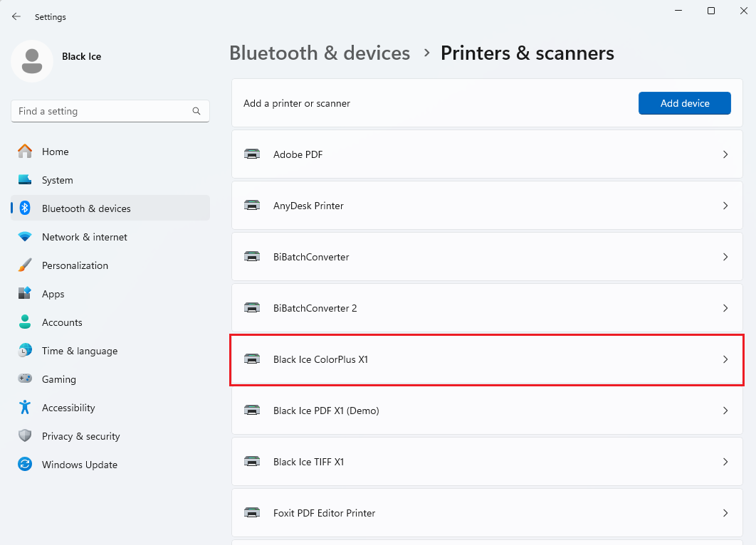 - On Windows 11 Desktop systems: Click on the Black Ice Printer Driver > Click “Printing preferences”.