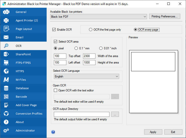 The selected OCR language contains data about the character set used in the language, and the OCR results will be more accurate if the user selects the language in which the document is written in. By default only the English OCR language is available in Black Ice Printer Drivers.