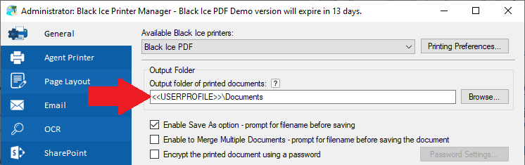 Configure the output file directory for all users. Environment variables can be used to apply global output directory settings with user-specific folders. Make sure that the printer driver has the appropriate permissions to create the files in the directory.