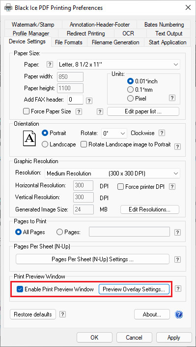 To enable the Preview feature, please navigate to Control Panel > Devices and Printers > right-click on the Black Ice Printer Driver > Printing Preferences > Device Settings tab, and check the Show Print Preview Window checkbox.