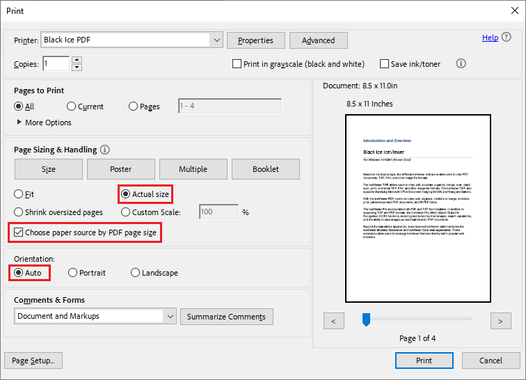 3. Under the Page Sizing & Handling section, please make sure to select the Actual size option, and enable the Choose paper source by PDF page size checkbox. Under the Orientation section, please select the Auto option.