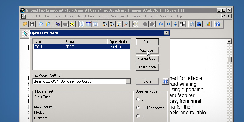 Impact Fax Broadcast can be configured to Automatically Open a COM Port during startup.Open Impact Fax Broadcast.To configure the automatic port opening, go to the Open > COM port...The Open COM Ports window opens. Select the desired COM port, and click on Auto Open button.The Open Mode column next to the selected COM port changes to AUTO, if the configuration successfull.Next time when the user start Fax Broadcast, the selected COM Port automatically opens. Thank you for using Impact Fax Broadcast. Click here to see more tutorials.