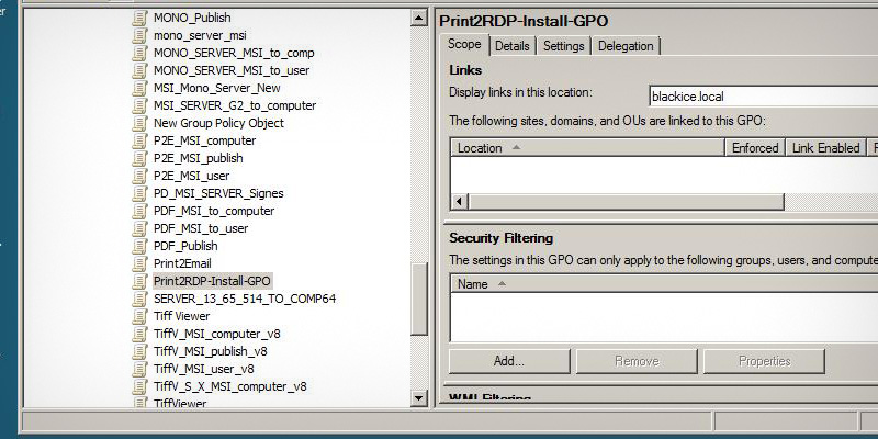 Before start, make sure that the deployable Print2RDP MSI file is in the shared folder (Distribution Point) and the folder has the appropriate rights. An existing transformation is needed to complete this tutorial. New transformation file can be created easily following our How to use MSI Client Install documentation.Go to the Start > Administrative Tools > Group Policy Management.In the Group Policy Management, expand the Forest and Domain.Select the Group Policy Object category.Right click on the Group Policy Object category, and click New.Enter the name of the new Group Policy Object, and click Ok to create the new object. When finished, double click on the created Group Policy Object.In the selected Group Policy Object, click on the Settings tab, right click on the panel and select the Edit.The Group Policy Management Editor opens. The Administrator can assign the deployable product for users or computers in the domain. Now the product will be assigned to a User.Double click on the User Configuration item.Double click on the Policies item.Double click on the Software Settings item.Double click on the Software installation item.Right click on the Software installation panel, and select New > Package...Browse the distribution point folder, select the MSI package and click Open.Select Advanced, and OK.In the Properties, go to the Modifications tab, and click on Add button.Browse the folder where the transformation file is located. Select the file, and click the Open buton.In the Properties, go to the Deployment tab, and select the Assigned at the Deployment type area, and basic at the Installation user interface options area. Click Ok when finished, and close the GPO Editor.In the Group Policy Management, select Scope tab.Under the Scope tab, the Authenticated Users group applies to every user who logs in. In this case it will only be deployed to one user. Select Authenticated Users and click on Remove.Click OK.Click Add... button to add users.Check only the Users, and click Ok.Click on the Advanced... button.Click Find Now button, and select the users to add. When finished, go back to the Group Policy Management.The Administrator need to link this GPO to a domain. Right click on the domain, and select Link and Existing GPO...Select the Group Policy Object, click OK, and the Group Policy Object has been configured. The product will be deployed when the user logs in. Thank you for using Black Ice Print2RDP. Click here to go back to the Tutorials.