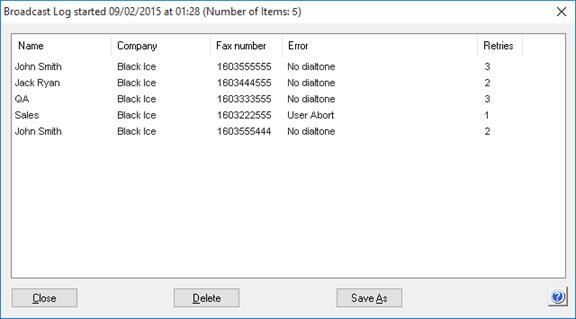 The top part of the window will display the date and time that the fax broadcast was started as well as the total number of items in the list (useful for long lists).