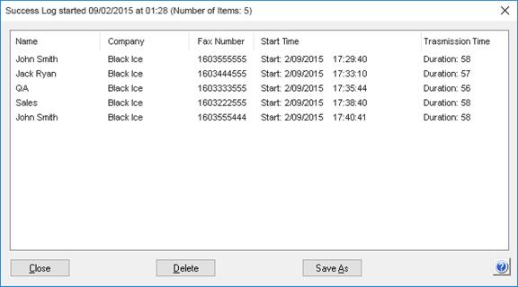 The second type of log file is the Success.log file. When a fax transmission is successful during a broadcast, the entry is deleted from the Broadcast.log and is entered in the Success.log. It contains the contact name, company name, fax number of the recipient and the start time and duration of the transmission. Please note that the transmission time only reflects the amount of time that the fax was transmitted from one end to the other and does not include time spent dialing, negotiating or disconnecting.