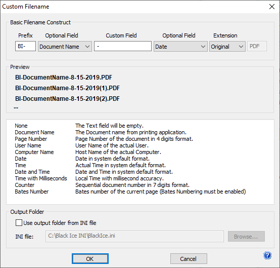 Use output folder from INI file – One can configure a Black Ice Printer Driver INI file which specifies the output directory where to save the generated documents. In order to use the output folder from an INI file, enable the Use output folder from INI file option, browse an INI file. The INI file must contain the following information:
