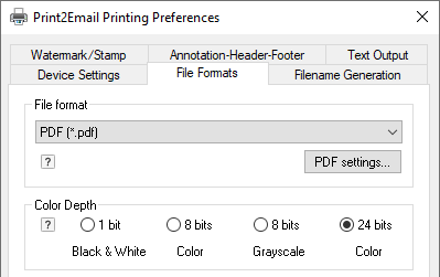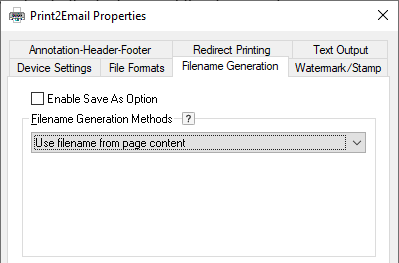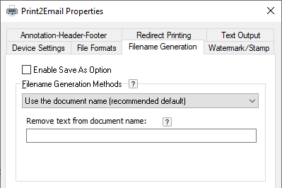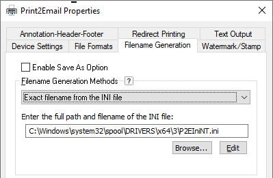 File Name = must be the exact filename. The printer driver will save the converted documents with this exact filename. The filename can be specified with or without the path. In case of specifying the filename without the path, the Printer Driver saves the file to the output directory configured in Control Panel > Printers and Devices > right click on the Printer > Printing Preferences > Filename Generation > Output Directory.