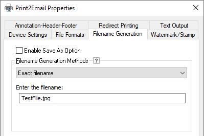 If Exact filename is selected, and a filename with extension is provided, (for example, testfile.jpg) the printed document is named with the .jpg extension and the settings under the File Formats tab are ignored.