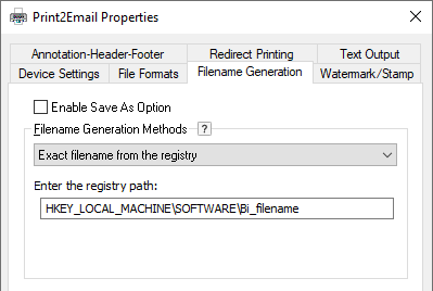 The Printer Driver can be configured to read the exact filename from a specified registry key. The registry path must be under the HKEY_LOCAL_MACHINE root key, and the value name containing the filename must be File Name as on the image below. The filename can be specified with or without the path.