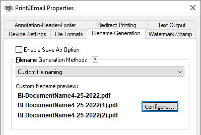 Custom file name scheme can be built using the Custom File Name utility. A preview shows the selected custom file naming scheme if the output contains multiple files. If the result of the document conversion is a single output file, for example, PDF file, the filename follows the first line of the example. Press Configure… to modify settings. To use custom file naming scheme, disable the Enable Save As Option. For more information, please see the Custom File Name Configuration section.