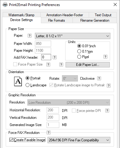 If the Create faxable image is checked, the printer driver forces a fax optimized resolution. The paper sizes and graphic resolutions are not restricted, but the end result image file has a faxable page size and fax-compatible resolution. For example, if the page is Letter paper size and 600 DPI, the generated file width is set to 1728 pixels.