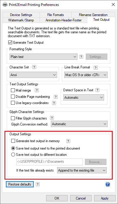 One can configure where to save the Text Output generated by the Printer Driver. By default, the text output will be generated next to the printed document.