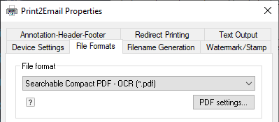 To navigate to the PDF Settings, go to the File Formats tab, select the Searchable Compact PDF file format and click PDF settings…