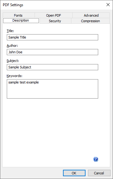 The PDF settings… button on the File Formats tab displays a dialog that allows the user to specify a number of settings for the printed PDF document. The PDF settings… button is only enabled if the selected file format is PDF.