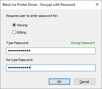 During the printing process, the user will be prompted with the Encrypt with Password window to enter a password for the printed document and select the protection type of Viewing and Editing.