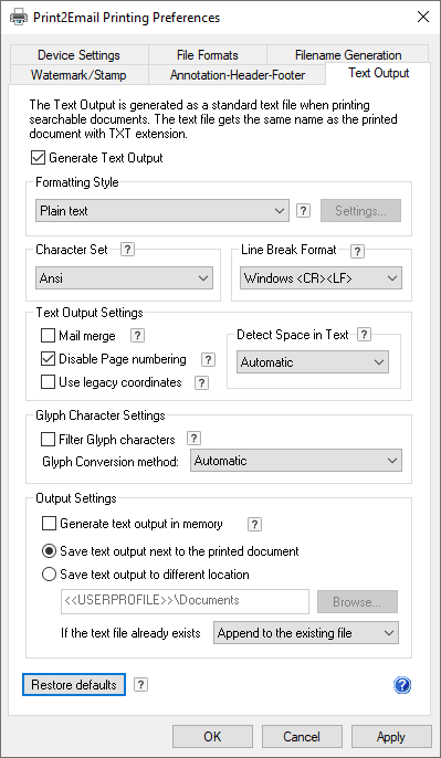 When printing to a multipage file format, such as PDF or TIFF, every page will be in one single text output. When printing to a single page file format or with the Save each page as separate file option, every page will be in a separate text output file.