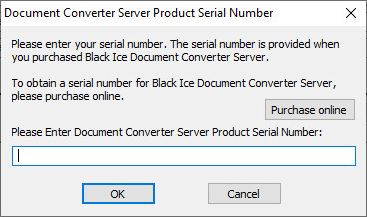 Enter the serial number in the text field and press OK. The serial number is in the body of the email containing download instructions for Document Converter Server.