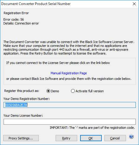 When the proxy settings are configured press OK to save the settings, and Retry to try the registration again.