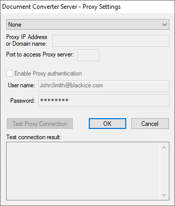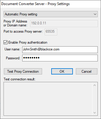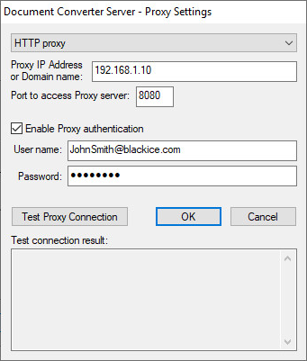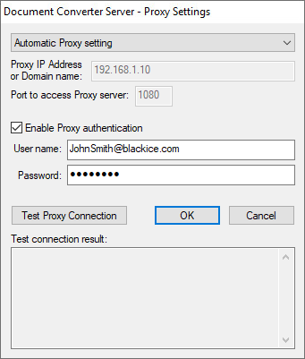 After entering the IP Address/Domain Name, Port, and possible Authentication Credentials to access the Proxy Server desired to use, click the Test Proxy Connection button to test the connection through the Proxy Server towards the Black Ice License Server.