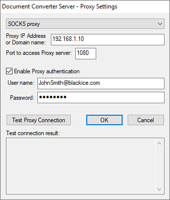 SOCKS Proxy - Select SOCKS proxy from the drop down list to configure the Proxy IP address and port number manually. SOCKS proxy servers establish a TCP connection to licenseserver.blackice.com and forward TCP messages from the Black Ice Printer Driver during registration and license validation.