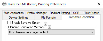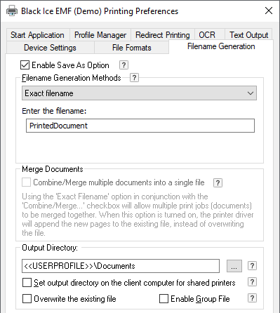 File Name = must be the exact filename. The printer driver will save the converted documents with this exact filename. The filename can be specified with or without the path. In case of specifying the filename without the path, the Printer Driver saves the file to the output directory configured in Control Panel > Printers and Devices > right click on the Printer > Printing Preferences > Filename Generation > Output Directory.