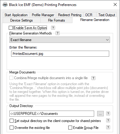 If Exact filename is selected, and a filename with extension is provided, (for example, PrintedDocument.jpg) the printed document is named with the .jpg extension and the settings under the File Formats tab are ignored.