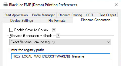 The Printer Driver can be configured to read the exact filename from a specified registry key. The registry path must be under the HKEY_LOCAL_MACHINE root key, and the value name containing the filename must be File Name as on the image below. The filename can be specified with or without the path.
