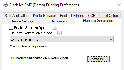 Custom file name scheme can be built using the Custom File Name utility. A preview shows the selected custom file naming scheme if the output contains multiple files. If the result of the document conversion is a single output file, for example, PDF file, the filename follows the first line of the example. Press Configure… to modify settings. To use custom file naming scheme, disable the Enable Save As Option. For more information, please see the Custom File Name Configuration section.
